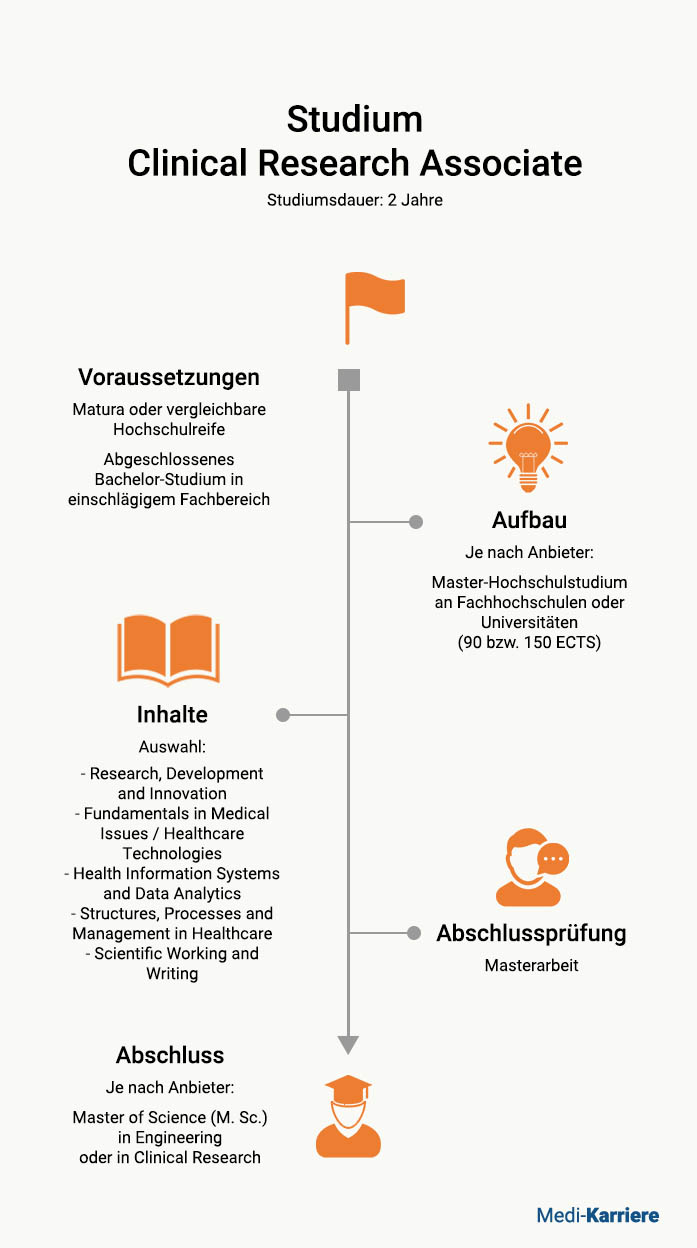 Einen eindeutig festgelegten Ausbildungsweg für den Beruf des Clinical Research Associate gibt es nicht. Wer in diesem Bereich arbeiten möchte, der kann das benötigte Fachwissen zum Beispiel während eines Masterstudiums in Digital Healthcare oder Clinical Research erlangen. Angeboten werden diese Studiengänge beispielsweise an der Fachhochschule St. Pölten, sowie an der Medizinischen Universität Wien. Auch eine Ausbildung im Gesundheitswesen befähigt zu einer Tätigkeit als Clinical Monitor. Zertifizierungsseminare werden von der TÜV Austria Akademie angeboten.