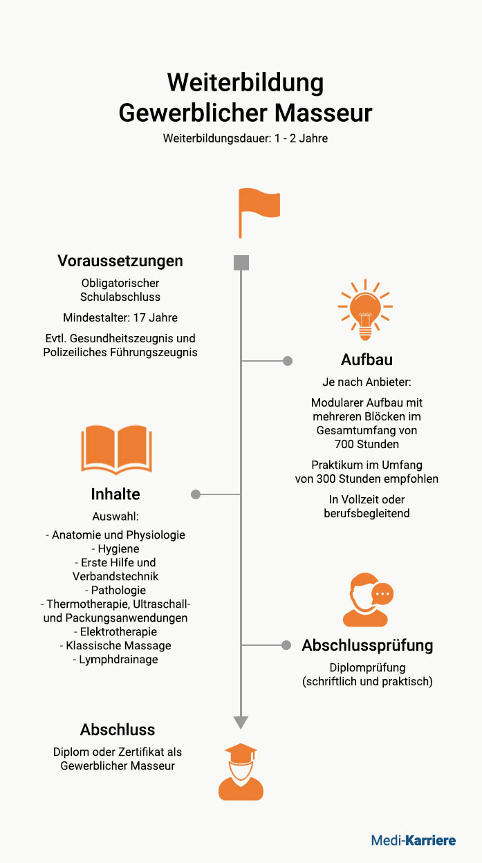 Die Aufschulung als Gewerblicher Masseur umfasst rund 700 Unterrichtseinheiten und 300 Stunden Praxis, die an Massageschulen oder Erwachsenenbildungsstätten vermittelt werden. In Vollzeit kann die Sonderausbildung innerhalb eines Jahres abgeschlossen werden, bei nebenberuflichen Schulungen dauert sie bis zu zwei Jahre. Dabei umfasst die Aufschulung zwei Module. Modul A beinhaltet vorrangig anwendungsorientierte Grundlagen, etwa zu Behandlungen, Therapien, Hygiene und verschiedenen Anwendungen. In Modul B lernen Kursteilnehmer Grundlagen in Bereichen wie Kommunikation und Dokumentation.