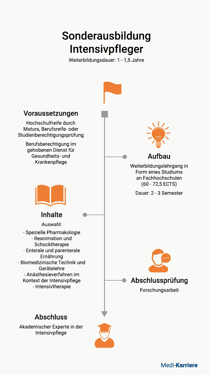 Die Sonderausbildung Intensivpflege dauert je nach Anbieter zwei bis drei Semester und umfasst dabei 60 bis 72,5 ECTS Punkte. Sie findet in der Regel berufsbegleitend statt. Sie wird mit einer Forschungsarbeit abgeschlossen. Nach erfolgreich absolvierter Weiterbildung tragen die Fachkräfte den Titel “Akademischer Experte in der Intensivpflege”.