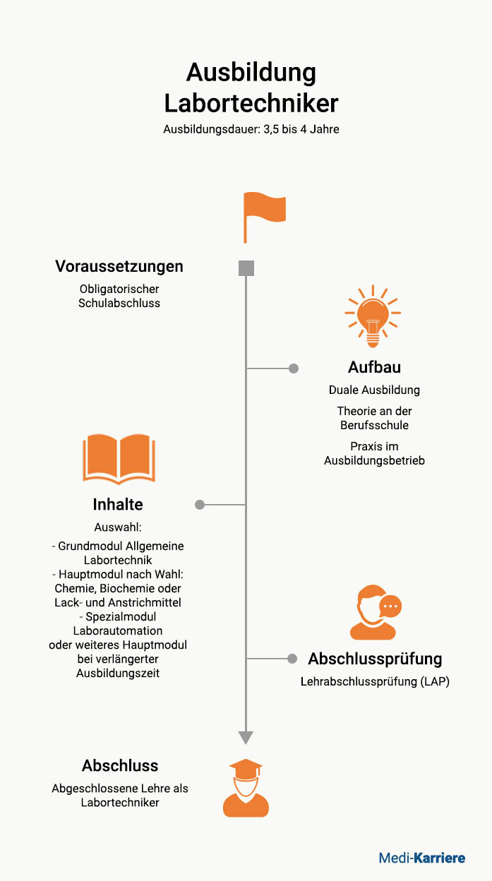 Die Ausbildung zum Labortechniker erfolgt als Lehrberuf im dualen System. Dabei besteht die Lehre grundsätzlich aus dem Grundmodul „Allgemeine Labortechnik“ und einem individuell wählbaren Spezialmodul aus dem Bereich Chemie, Biochemie oder Lack- und Anstrichmittel. Die reguläre Ausbildungszeit beträgt dreieinhalb Jahre. Sie umfasst insgesamt 1.440 Unterrichtsstunden in der Berufsschule bei einem Hauptmodul, bzw. 1.620 Stunden bei zwei Hauptmodulen. Davon entfallen je 360 Stunden auf die ersten drei Jahre und weitere 180 bzw. 360 im letzten Jahr. Hierbei ist eine Verlängerung der Lehre um ein halbes Jahr auf freiwilliger Basis möglich. In diesem wird ein weiteres Hauptmodul oder ein Spezialmodul behandelt.
