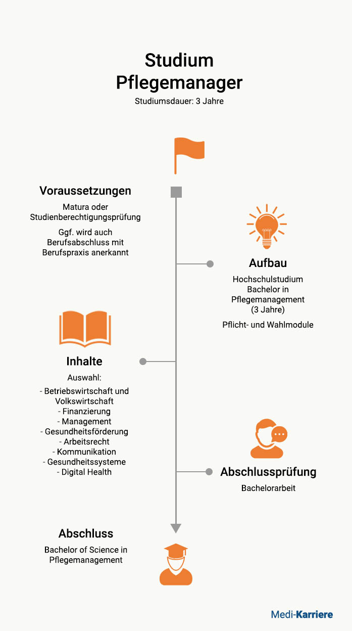 Ein reguläres Bachelorstudium im Bereich Pflegemanagement dauert drei Jahre (sechs Semester). Ein anschließender Master dauert weiterführend zwei Jahre (vier Semester). Angehende Pflegemanager können dabei etwa an der Fachhochschule Kärnten, an der Universität für Weiterbildung Krems oder an privaten Universitäten wie der Paracelsus Medizinischen Privatuniversität (PMU) studieren.