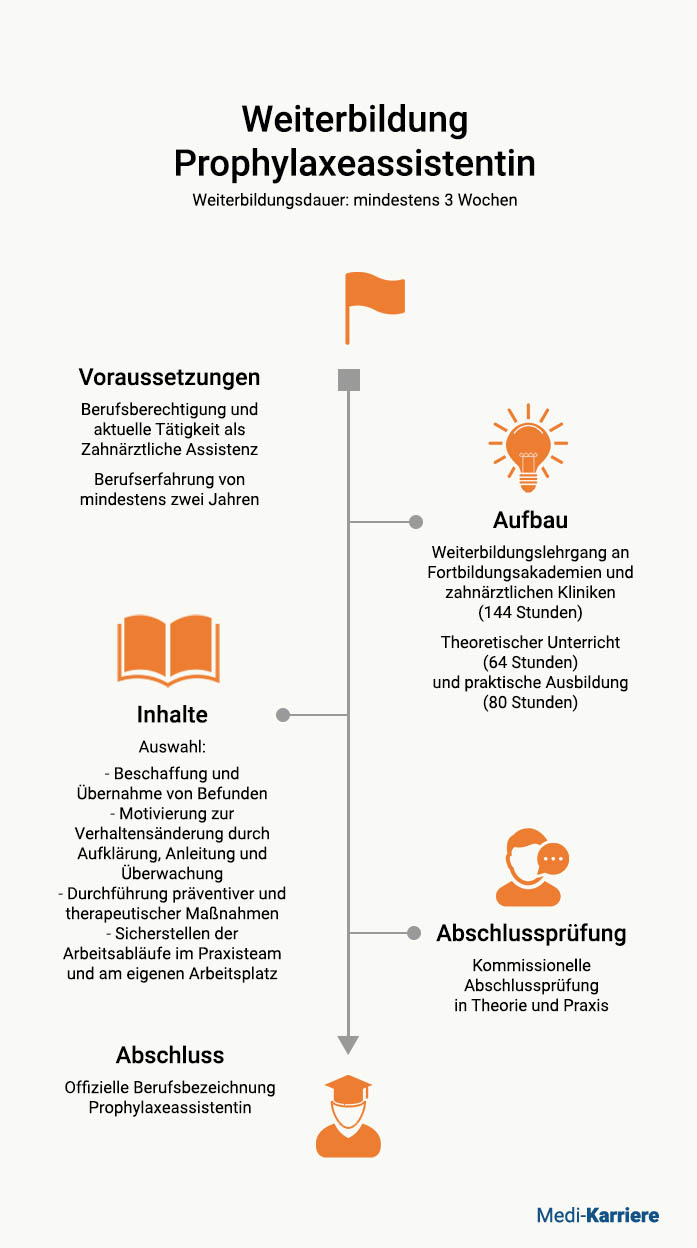 Während der Weiterbildung lernen angehende Prophylaxeassistentinnen prophylaktische Maßnahmen kennen, die Erkrankungen der Zähne und des Mundes, des Kiefers und des umliegenden Gewebes vorbeugen. Je nach Weiterbildungsinstitut liegt die maximale Teilnehmeranzahl bei 20 bis 25. Die Fortbildung wird an Fortbildungsakademien und zahnärztlichen Kliniken angeboten. Beispielsweise bieten die Salzburger Fortbildungsakademie, die Universitätszahnklinik Wien, die Prophylaxe-Akademie Wien und die Zahnklinik der Sigmund Freud Privatuniversität Wien entsprechende Lehrgänge an.