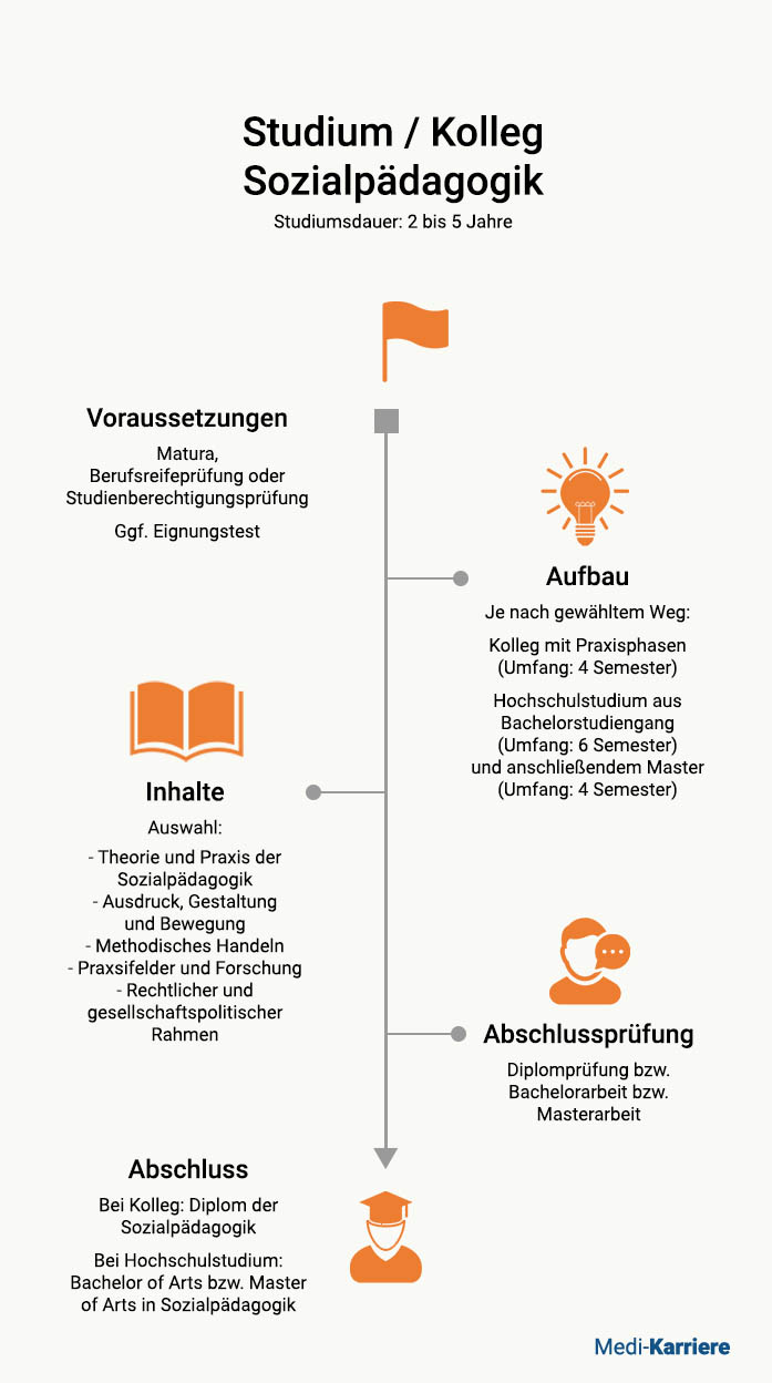 Der akademische Ausbildungsweg hingegen dauert mit einer Regelstudienzeit von sechs Semestern für das Bachelorstudium und weiteren vier Semestern für das Masterstudium länger. Fachhochschulen und Universitäten, die das Studienfach Sozialpädagogik anbieten, sind unter anderem die Alpen-Adria-Universität Klagenfurt, die Fachhochschule St. Pölten, die Fachhochschule Oberösterreich und die Paris Lodron Universität Salzburg.