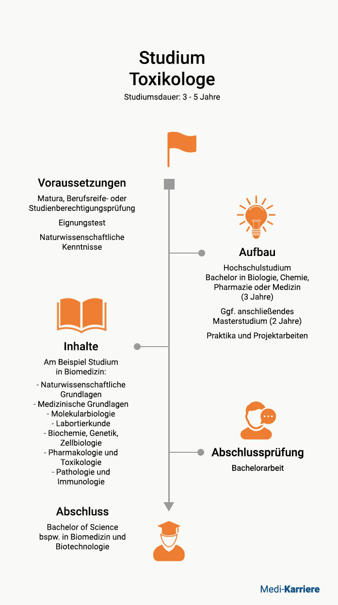 Die Berufsbezeichnung des Toxikologen ist nicht geschützt, weshalb keine geradlinige Ausbildung zu diesem Job existiert. In der Regel verläuft der Weg über ein Hochschul- oder Fachhochschulstudium in Fächern wie Chemie, Biochemie, Pharmazie, Biotechnologie, (Öko-)Toxikologie oder Medizin. Je nach Studiengang können sich die Anforderungen, sowie die Länge der Ausbildung unterscheiden. Ein regulärer Bachelor dauert in den entsprechenden Fächern meist sechs Semester (drei Jahre), ein anschließender Master vier Semester (zwei Jahre). Ein Human-, Veterinär- oder Zahnmedizinstudium umfasst in der Regel mindestens zwölf Semester (sechs Jahre).