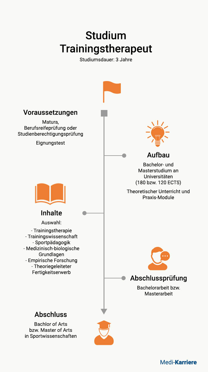 Wer als Trainingstherapeut arbeiten möchte, benötigt die Hochschulreife, um zum Studium zugelassen zu werden. Diese erlangen Interessenten in der Regel durch eine erfolgreich abgeschlossene Matura. Alternativ lässt sich eine Studienberechtigungsprüfung oder Berufsreifeprüfung ablegen. Des Weiteren ist vor Aufnahme des Studiums ein Eignungstest zu absolvieren, der die körperliche Tauglichkeit für den Studiengang abfragt.